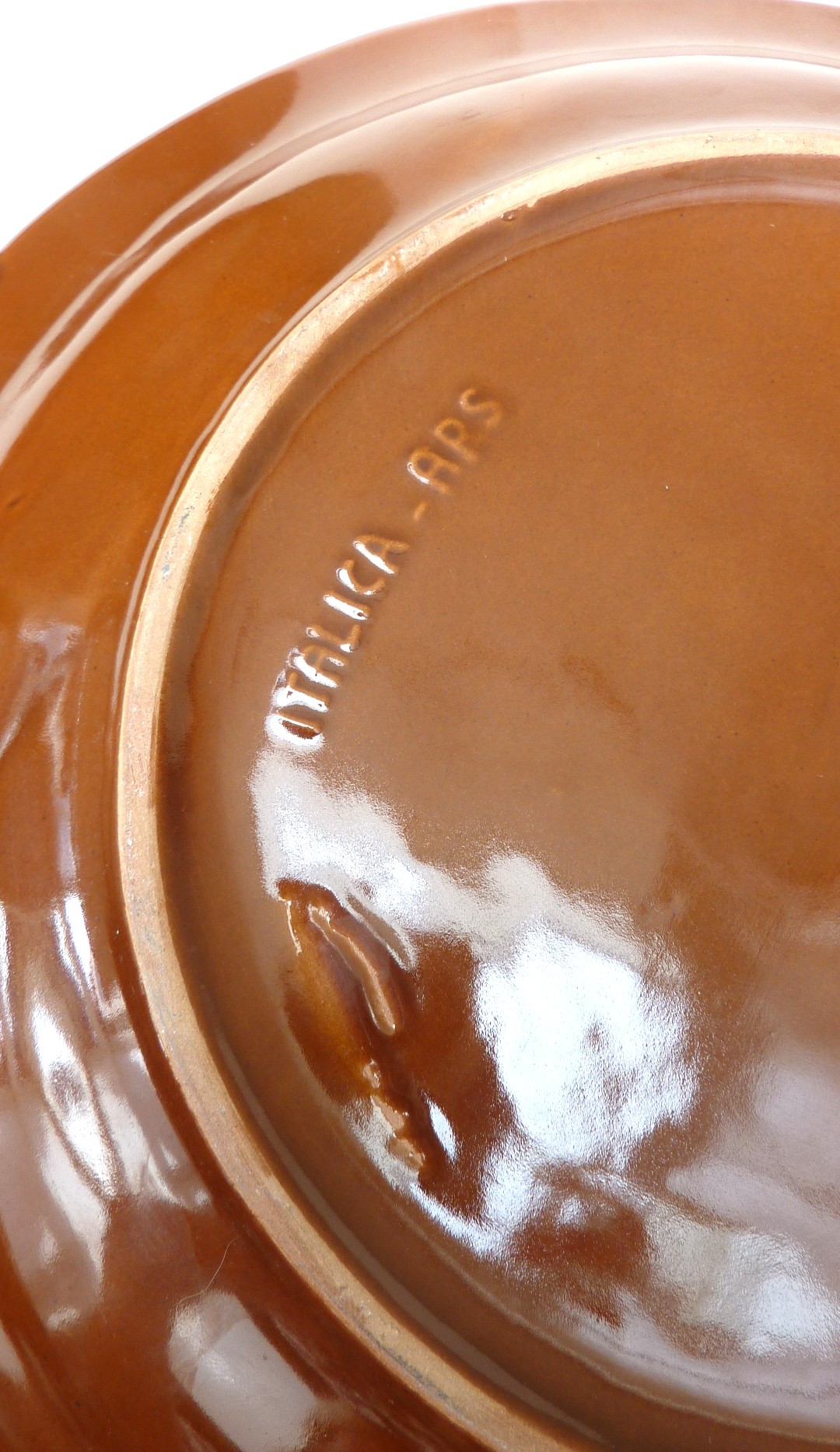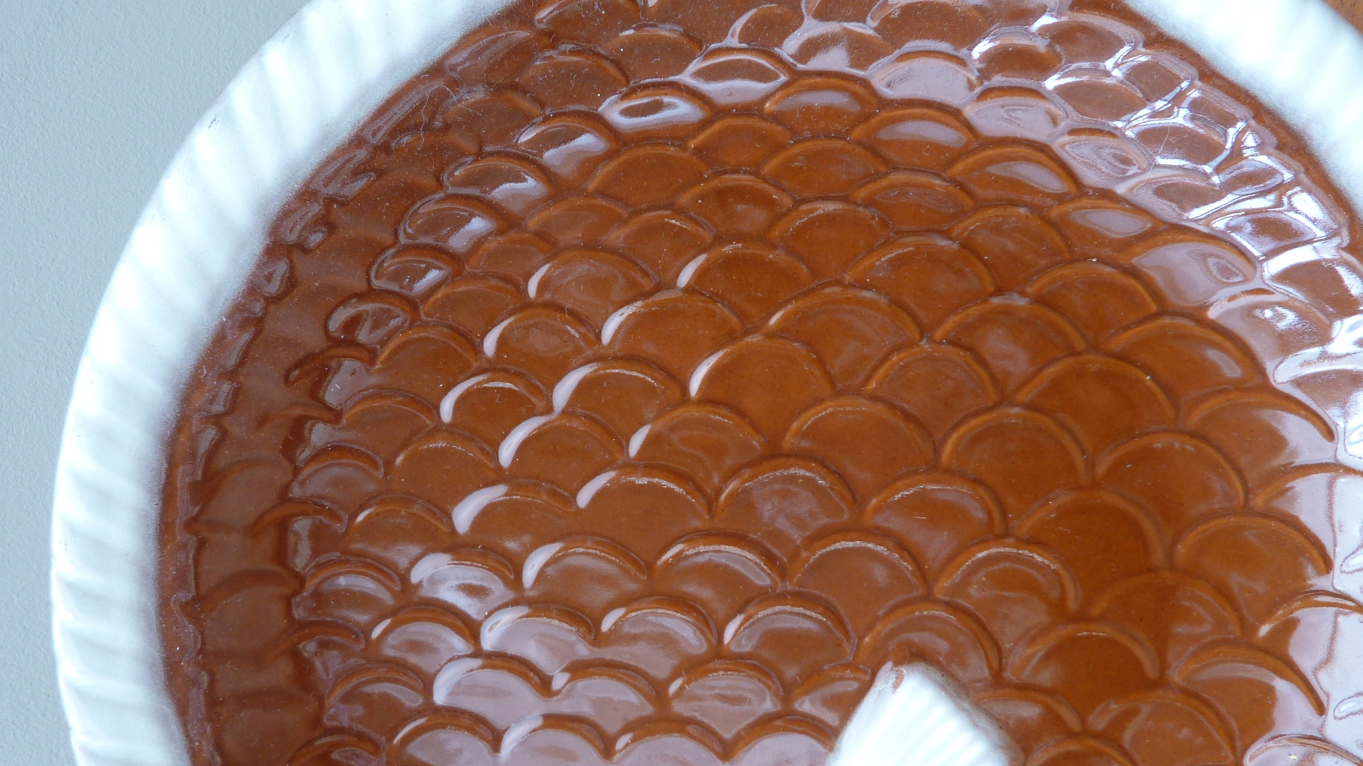 Grote majolica visschaal in de vorm van een platvis. In reliëf gedecoreerd met schubben. Kleurstelling donkerbruin en off-white.