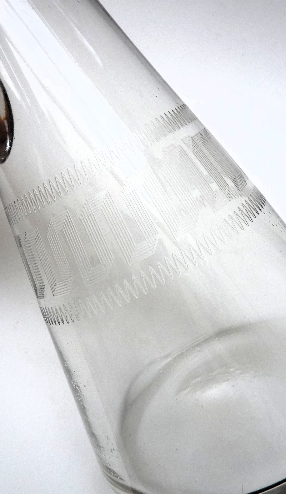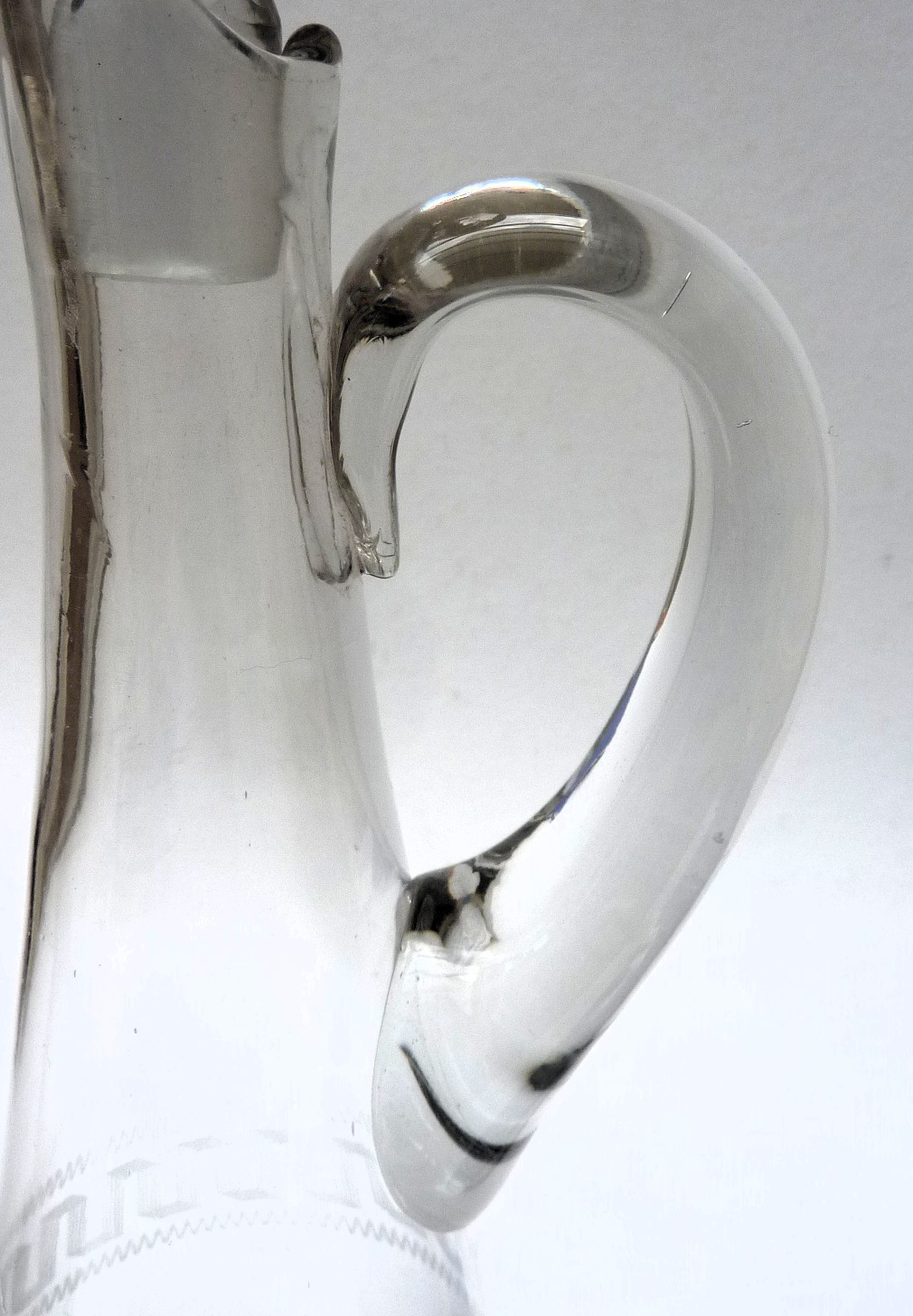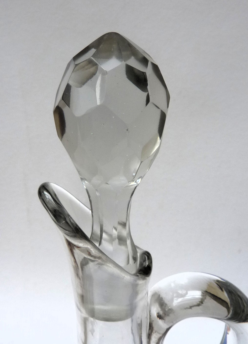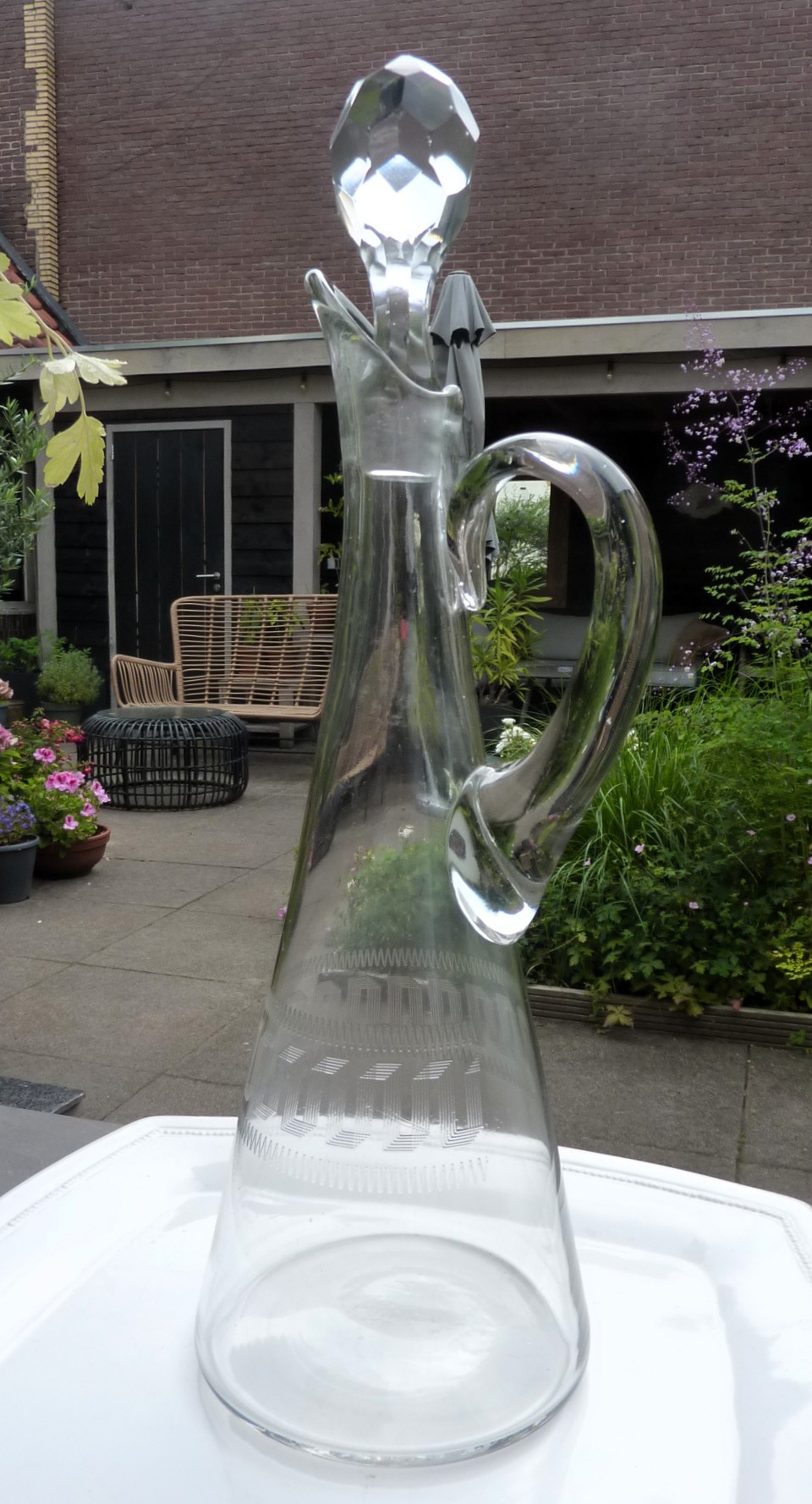 Kleurloze glazen oorkaraf in piramide model. Glad handvat en facetgeslepen stop, origineel bij de karaf. De karaf heeft op het lichaam een geguillocheerde gravure in het Griekse sleutel patroon.
