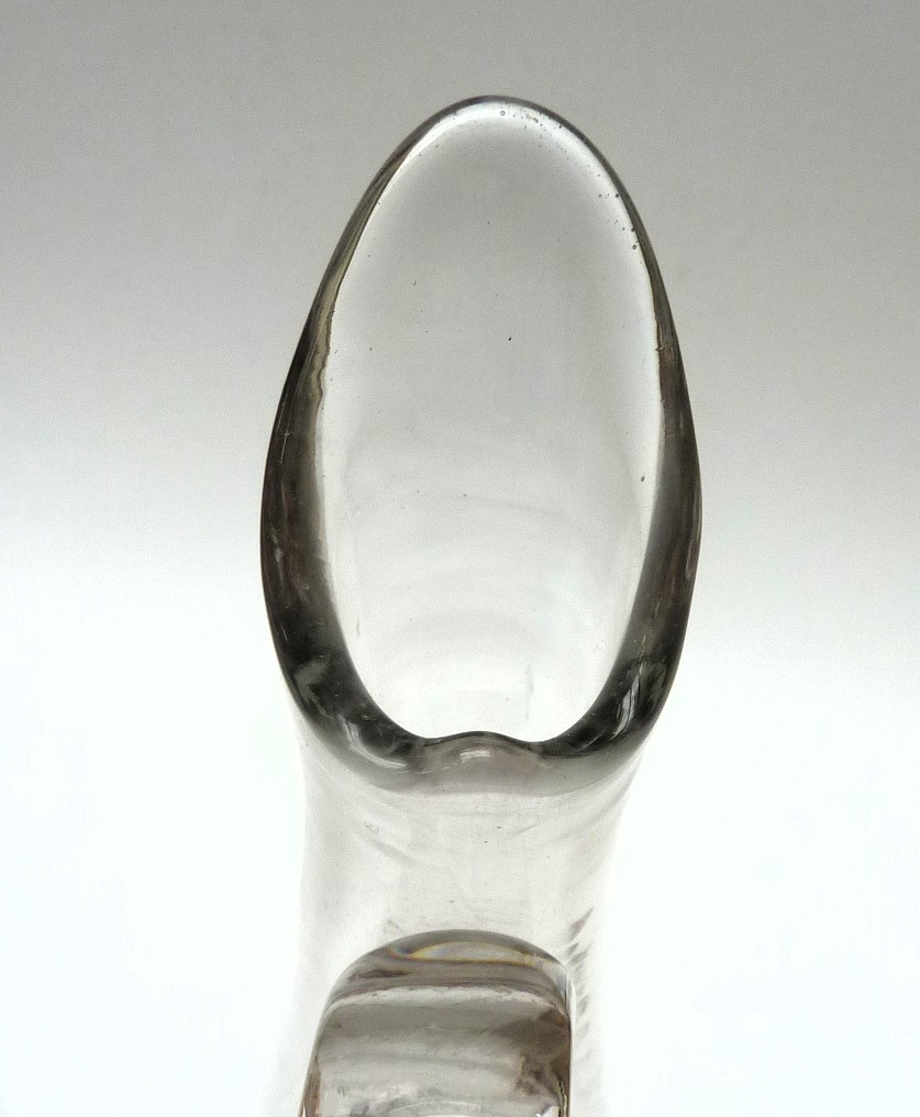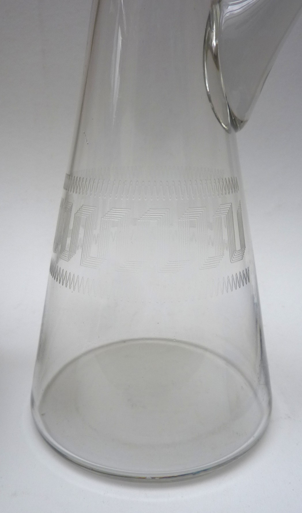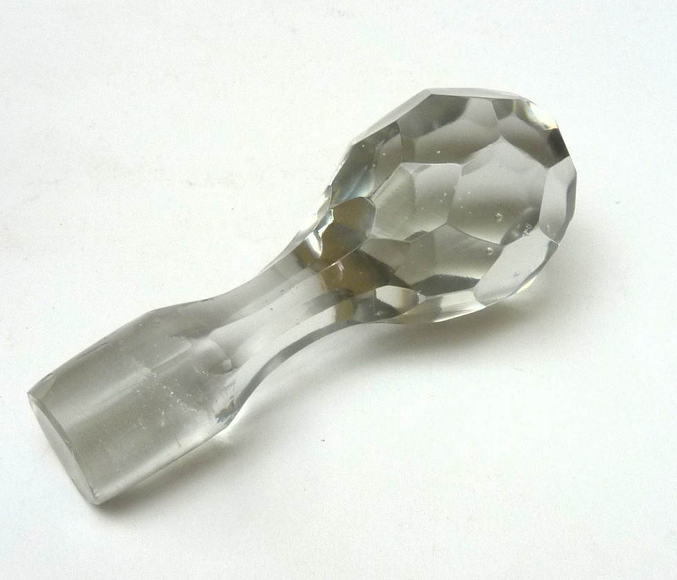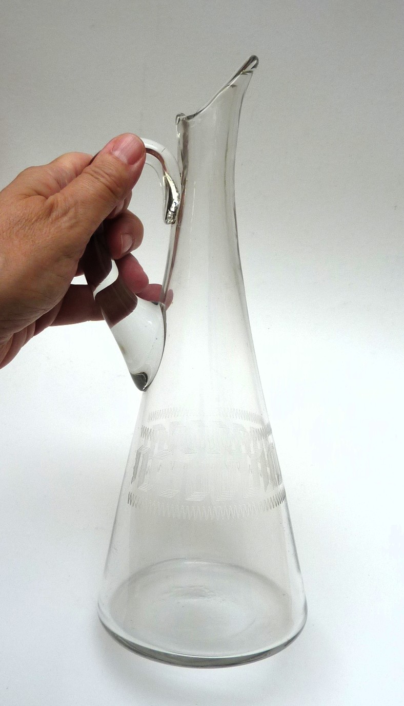 Kleurloze glazen oorkaraf in piramide model. Glad handvat en facetgeslepen stop, origineel bij de karaf. De karaf heeft op het lichaam een geguillocheerde gravure in het Griekse sleutel patroon.