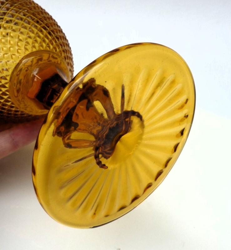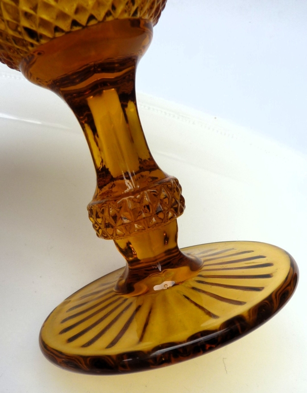 Amberkleurig persglazen waterglas, gedecoreerd met een gepunt ruitpatroon; biquinhos. In het Portugees, afgekort Bicos. Dit model werd sinds eind 19e eeuw in persglas geproduceerd door de Portugese glasfabriek Ivima (Nova Fabrica de Vidros Marinha Grande) en staat al vermeld in de catalogus van 1901. Ivima werd overgenomen door Vista Alegre, de Bicos serie bleef echter tot vandaag de dag in productie.