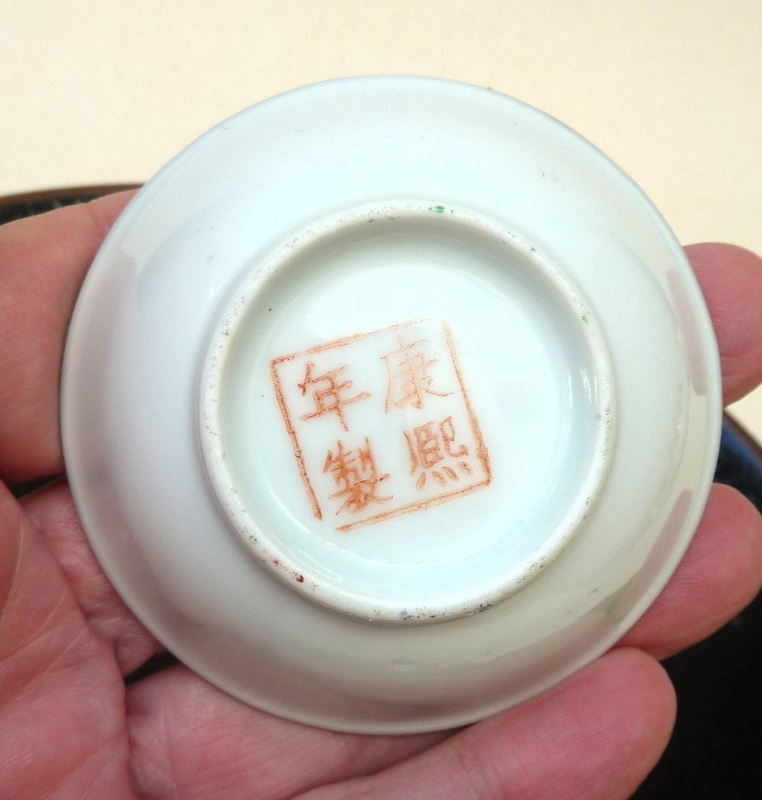 Rood vier karaktermerk op de achterzijde: 'Kangxi Nian Zhi (Kangxi Period Make). Te dateren 1960 - 1970. Gedecoreerd in Hong Kong.
