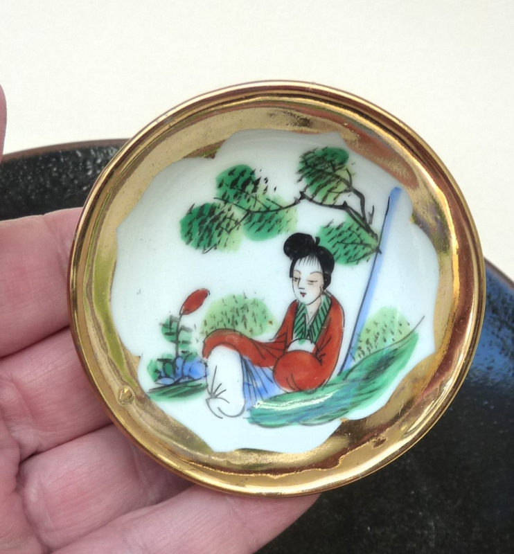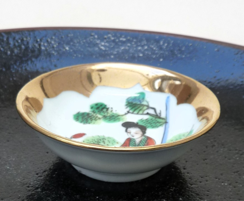 Chinees porseleinen schaaltje voor gember of saus. Handgedecoreerd met een dame, zittend in een tuin. Brede gouden rand.
