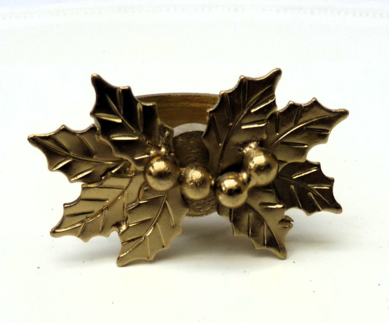 Feestelijke set van vier goudkleurig metalen servetringen, gedecoreerd met hulstblad. Het hulstblad is een magneet, waardoor de decoratie op verschillende manieren op de ring kan worden gezet.