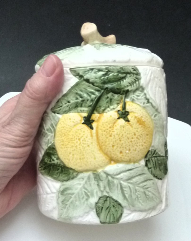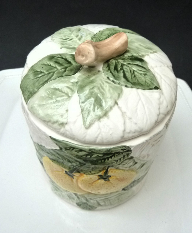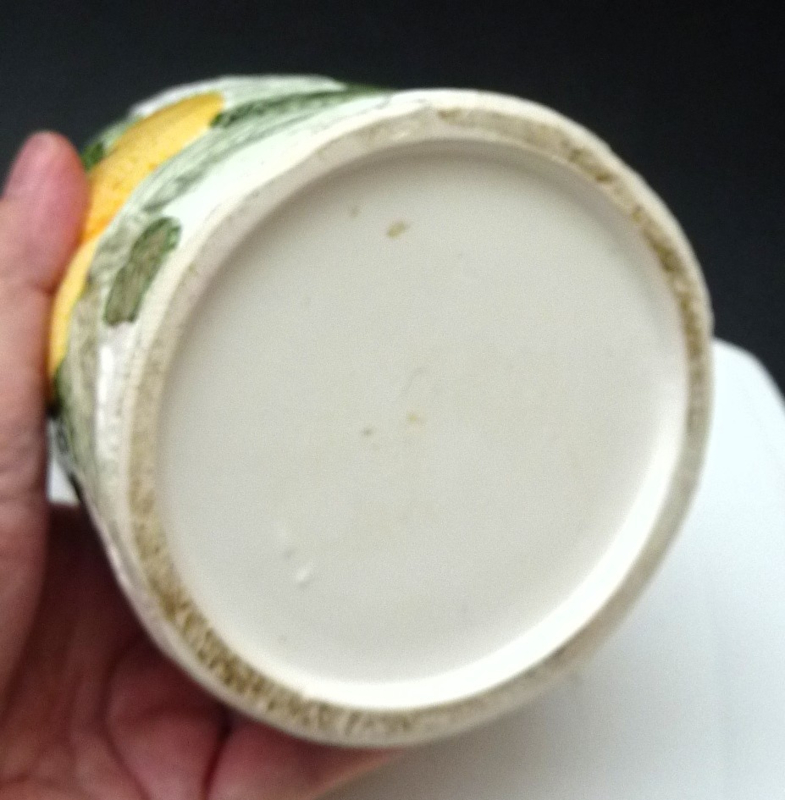 Barbotine aardewerken voorraadpot, in reliëf gedecoreerd met een bladerenpatroon en citrusfruit. Met de hand ingekleurd met groen en geel. Niet gemerkt maar toegeschreven aan Lord & Taylor, Japan, jaren 50.