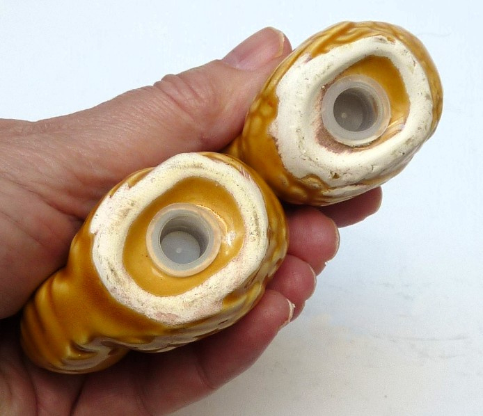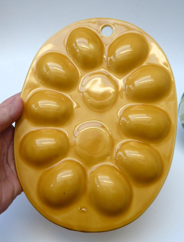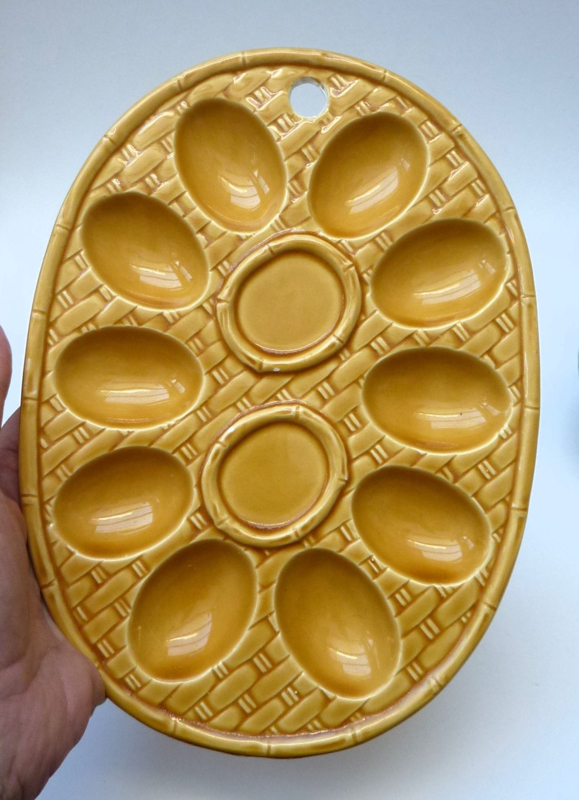 Keramische schaal voor tien gevulde eitjes en een peper- en zoutvaatje in de vorm van een kip. De schaal is hoogglans okergeel geglazuurd en gedecoreerd met een geweven patroon.