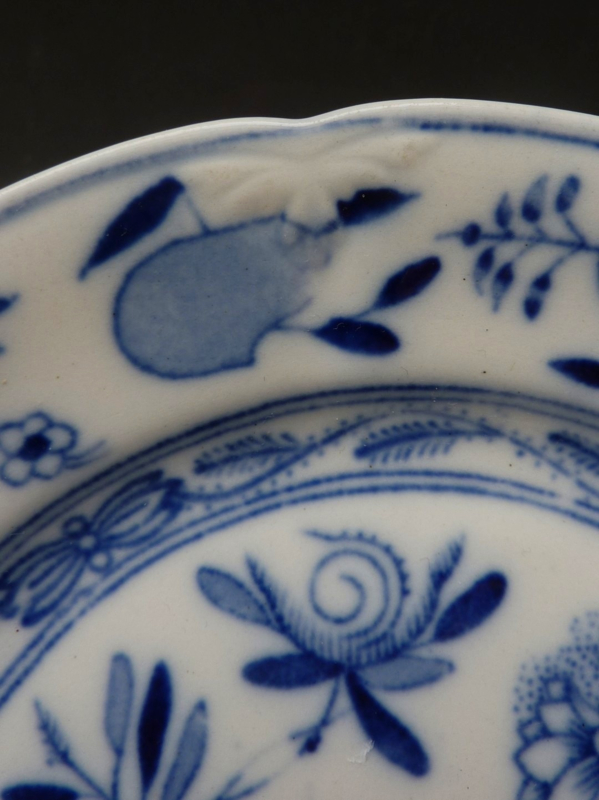 Antiek bordje met Zwiebelmuster decoratie, gemaakt door Louis Regout / Mosa. De geschulpte rand is in reliëf gedecoreerd met florale patronen.