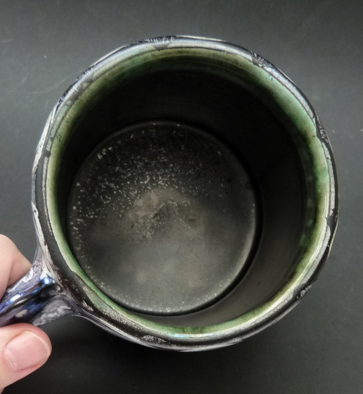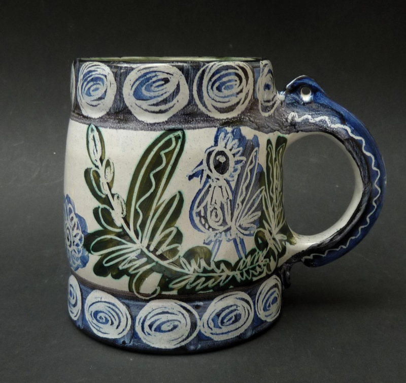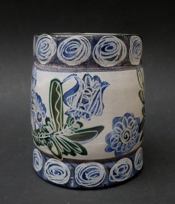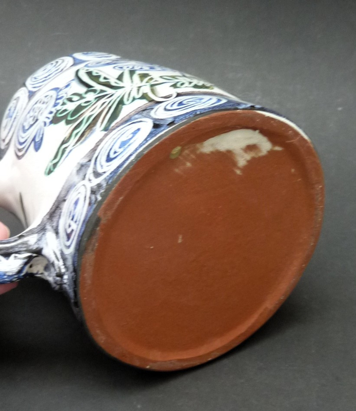 Handgemaakte grote pul, gedecoreerd met takken en vogels, geglazuurd in de tinten grijs-wit, blauw en groen. Geglazuurd aan de binnenzijde, de onderzijde is ongeglazuurd. Goed te gebruiken als decoratieve vaas.