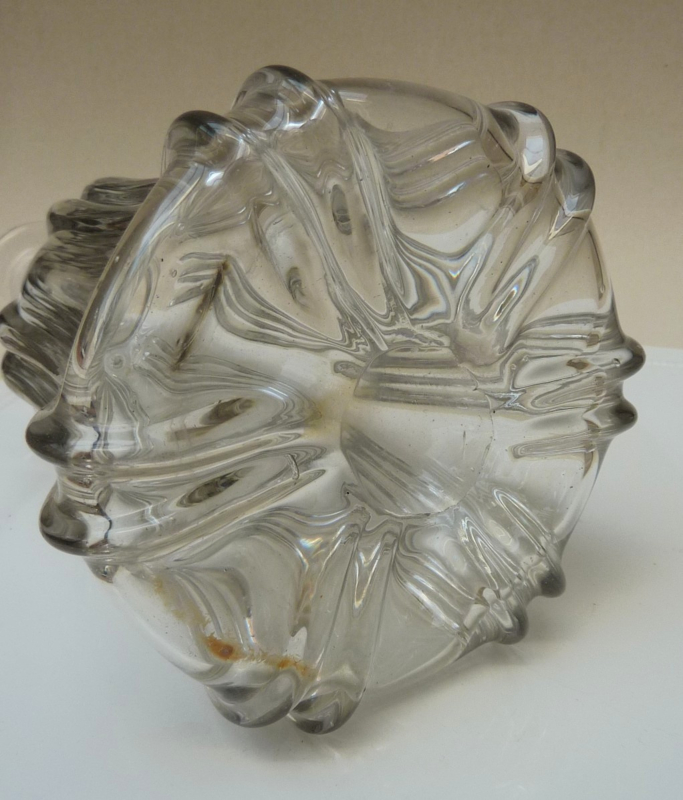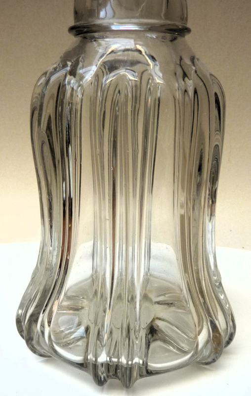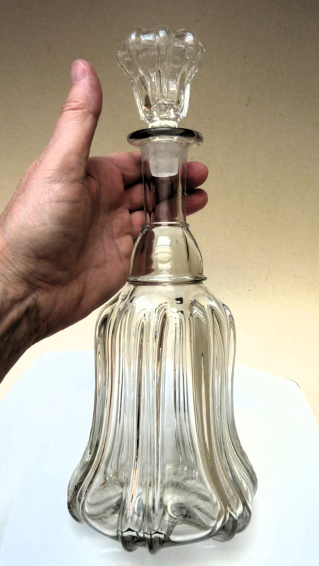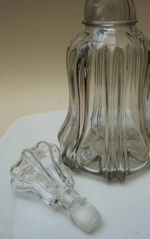 Glazen karaf met een geribd lichaam in een klokvormig model. De 6 ribben zijn dubbel uitgevoerd, de hals heeft een dubbele ring. De originele holle stop sluit qua model prachtig aan op de vorm van de karaf. Dit model wordt ook wel een Newcastle karaf genoemd.