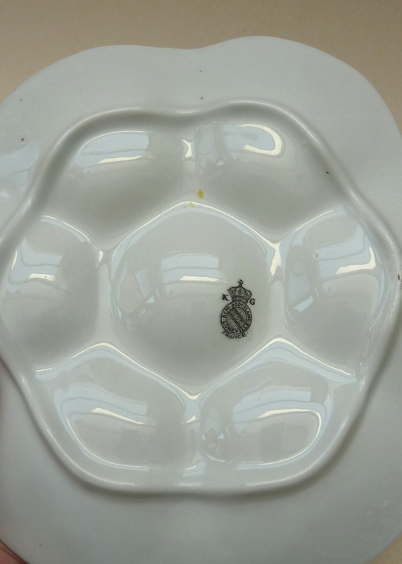 Antiek demi porcelaine oesterbord van producent Keller & Guerin, Lunéville, Frankrijk, rond 1895.