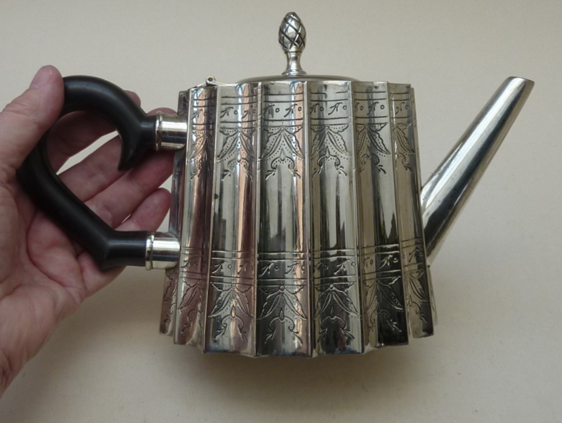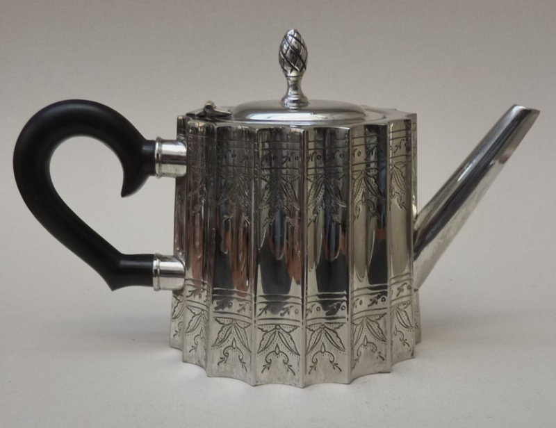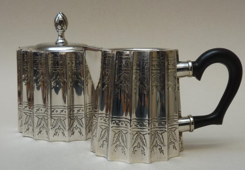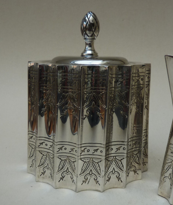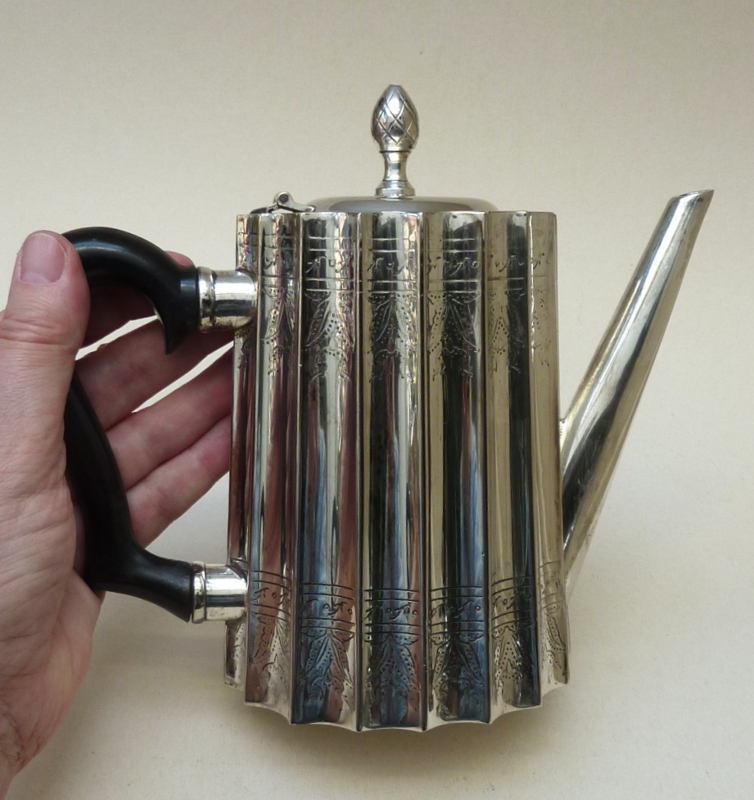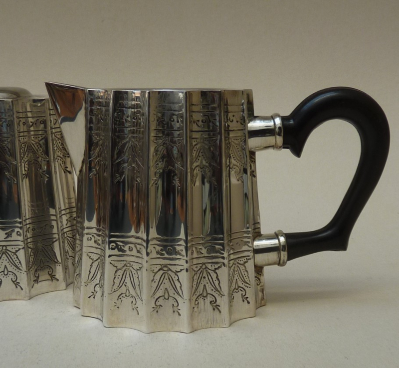 Vierdelig verzilverd koffie- en theeservies, bestaande uit een koffiepot, theepot, roomkan en een suikerpot met deksel. Uitgevoerd in een geribd model met gegraveerd decor. Bakelieten handvatten. De koffie- en theepot hebben een scharnierend deksel.