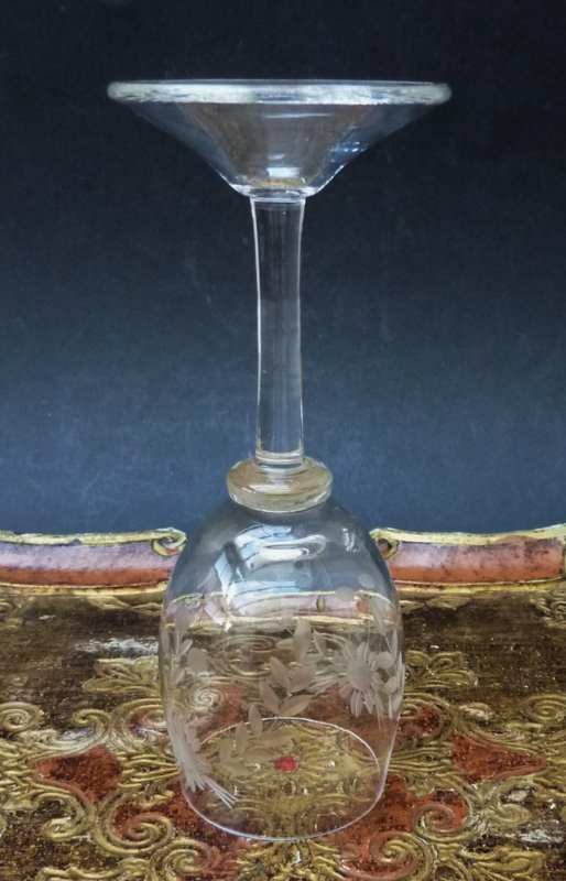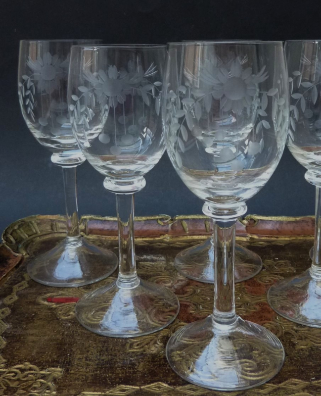 Mooie set van zes wijnglazen in een iets kleiner model, geschikt voor het serveren van port of dessertwijn. De kelk van de glazen is gegraveerd met bloem guirlandes. De voet is conisch vormgegeven.