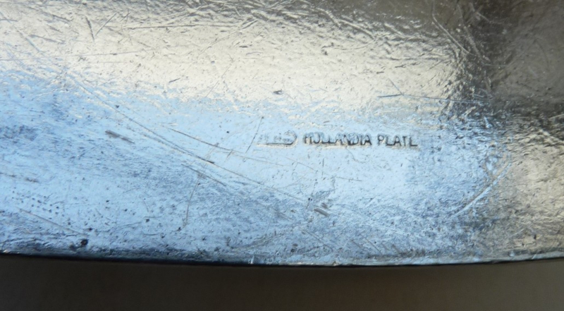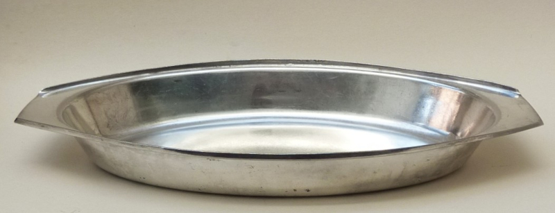 Grote, schuitvormige, verzilverde dienschaal van Hotelware producent Hollandia Plate. De schaal is gebruikt in een hotel of restaurant en heeft een karakteristieke, doorleefde 'look and feel'.