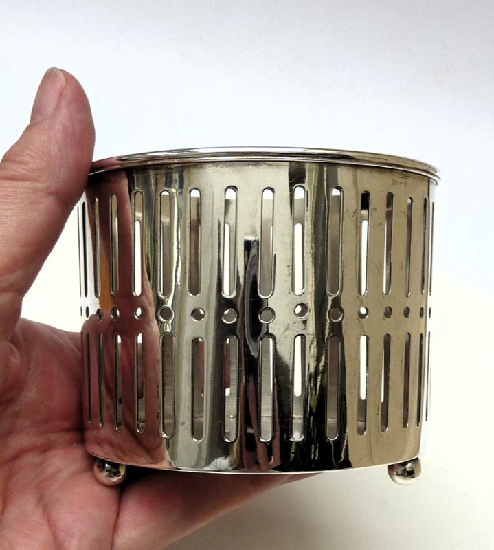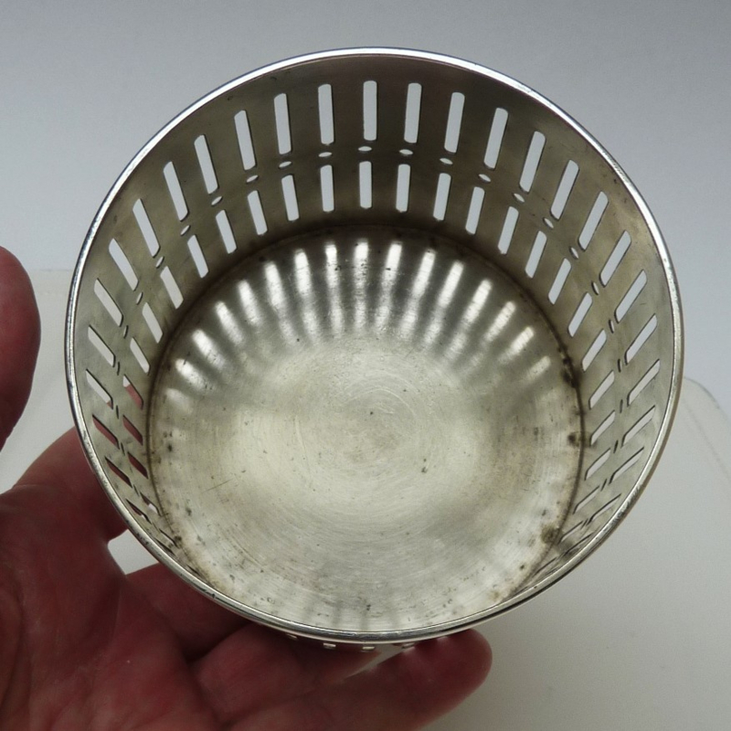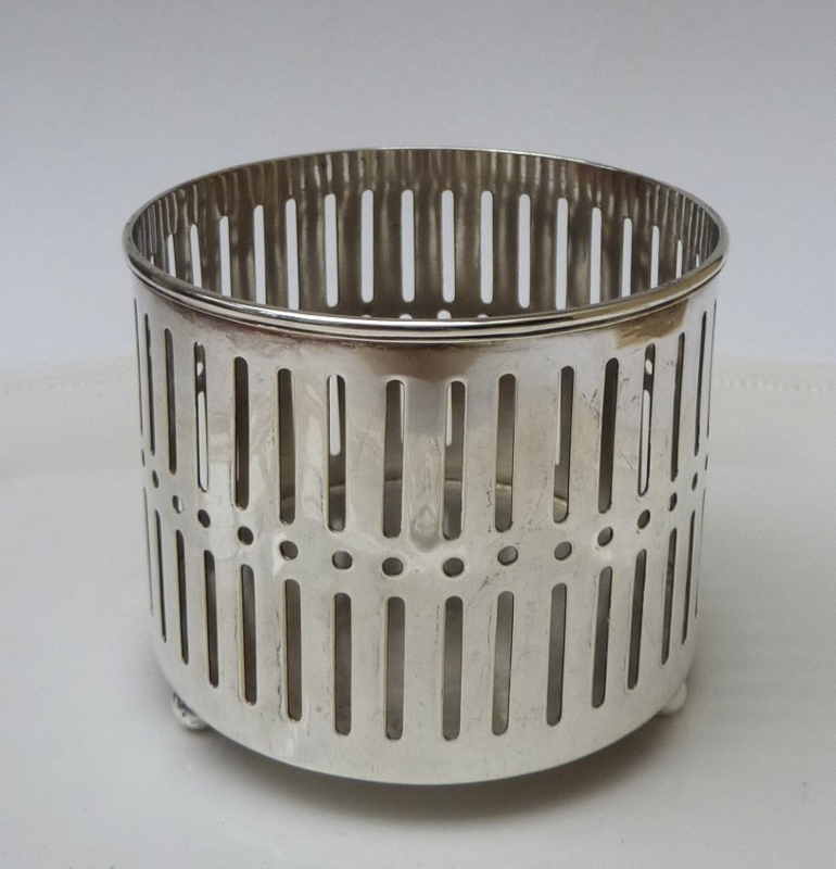 Verzilverde flessenbak gedecoreerd met een opengewerkt patroon. De bak staat op drie bolpootjes.