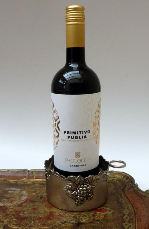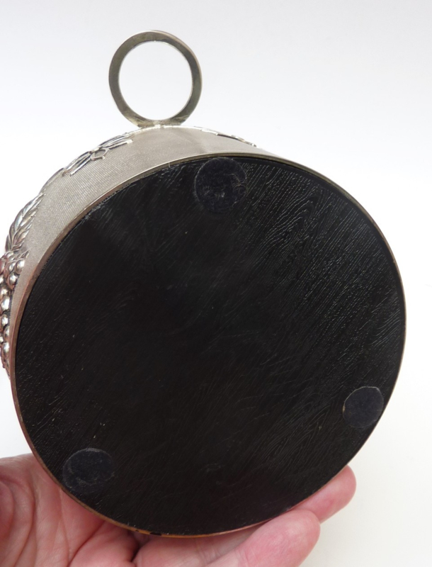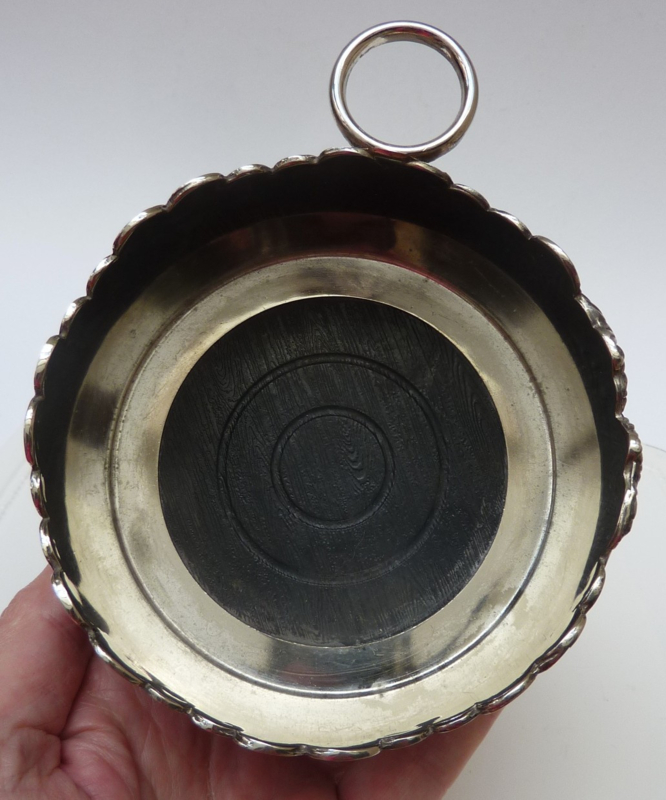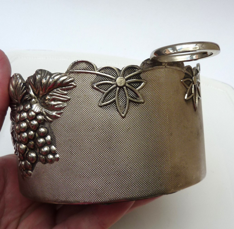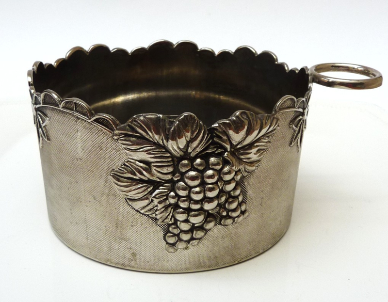 Verzilverde flessenbak met opgelegde decoratie van bloemen en een druiventros. Ringvormige greep. Zwarte kunststof bodem met houtlook. Geschulpte rand. Het verzilverde metaal heeft een oppervlakte met structuur, waardoor de bak een matte uitstraling heeft. Ruim model, ook geschikt voor een champagnefles.