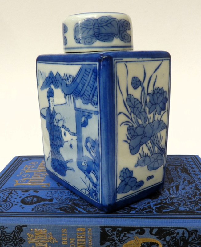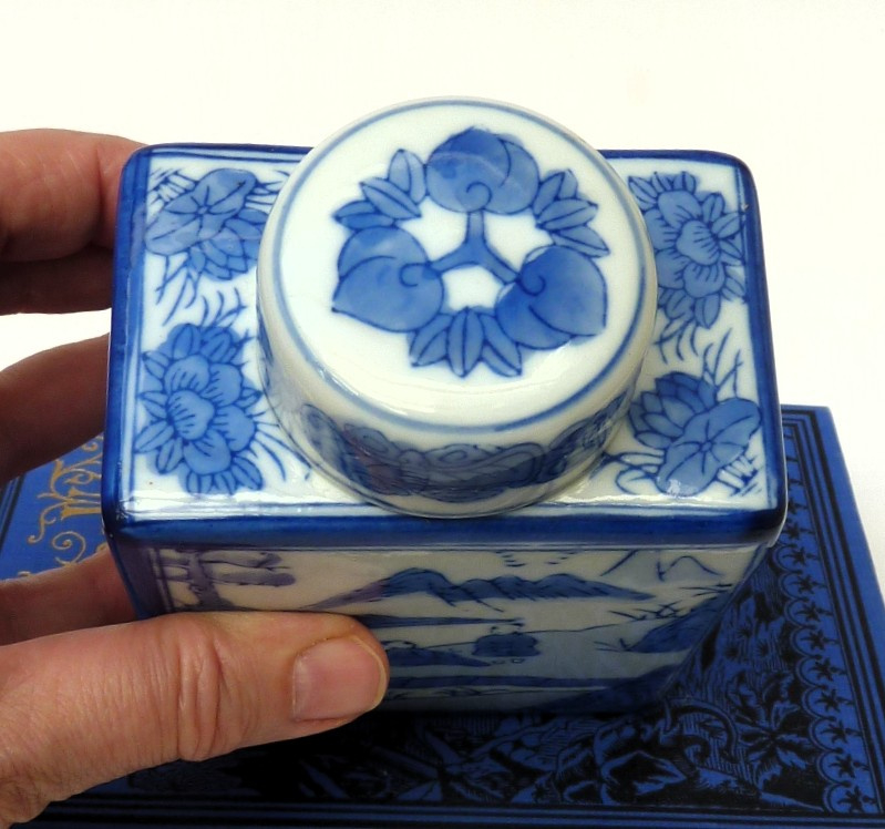 Rechthoekige porseleinen theebus, gemaakt in China in de 2e helft van de 20ste eeuw. Gedecoreerd met een blauw wit decor. Zware kwaliteit porselein.