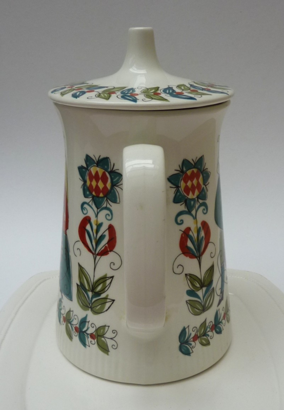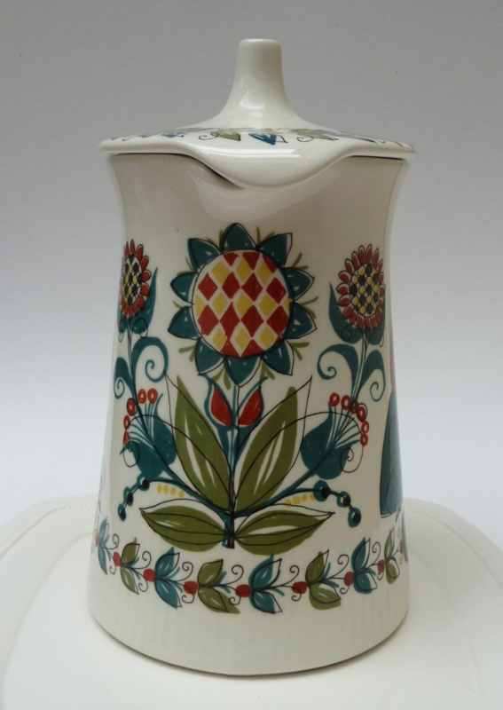 Figgjo Flint koffiekan met deksel, gedecoreerd met het op Noorse floklore geïnspireerde decor 'Saga'. Uitgevoerd in vitro porselein. Geproduceerd in de jaren 60-70, veelgezocht verzamelaarsitem.