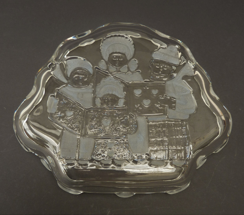 Walther Design glazen kerstschaaltje voor koek of chocolade gedecoreerd met een groep zingende kinderen. Gemaakt in Duitsland in de jaren 80.