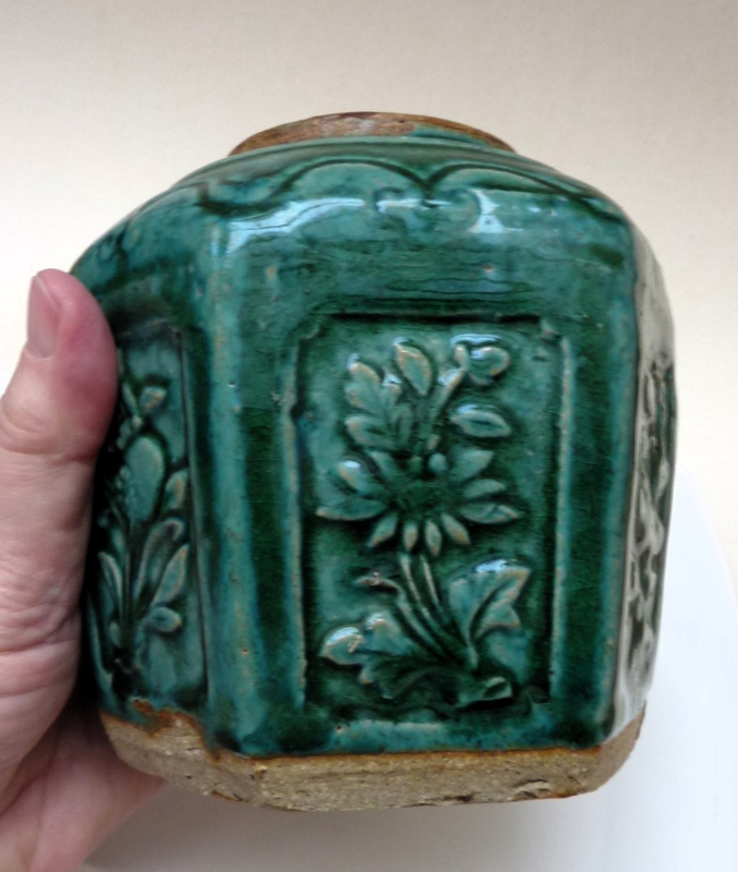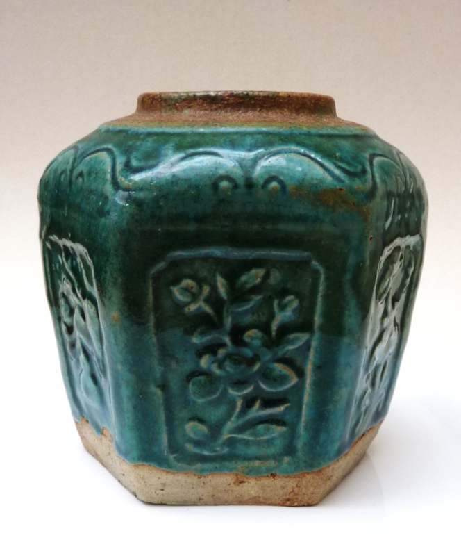 Decoratieve Chinese aardewerken Shiwan ware gemberpot, gemaakt in de tweede helft van de 19e eeuw (laat Qing) in Shiwanzhen, Foshan. De pot heeft een zeskantige vorm en is op de zijdes in reliëf gedecoreerd met verschillende soorten bloeiende planten. Het glazuur heeft een diepe kleur groen en is mooi gesleten op de hoeken. De bodemrand en de opstaande openingsrand zijn ongeglazuurd.
