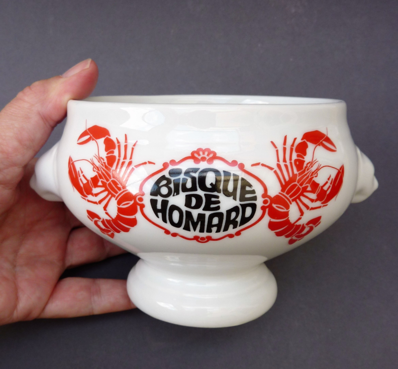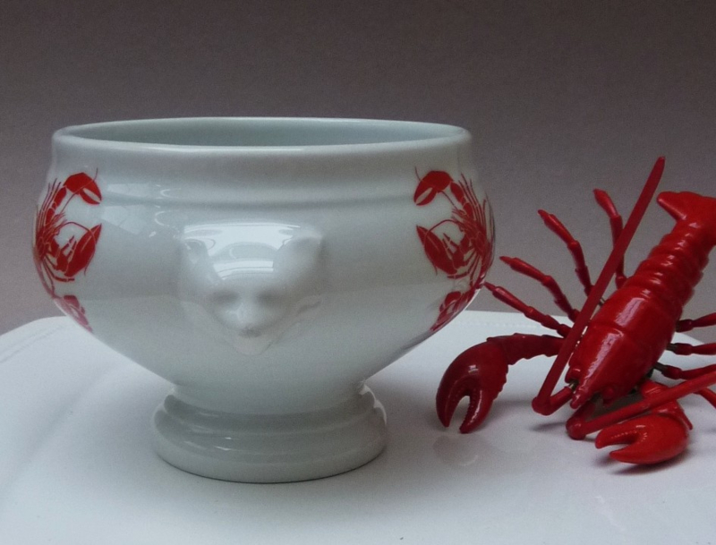 Prachtige porseleinen soepkom voor kreeftensoep, in de jaren zestig gemaakt door de Duitse producent van kwaliteitsporselein Seltmann Weiden. De kom is gedecoreerd met twee leeuwenkopjes en aan weerszijden met een sprekende voorstelling van twee rode kreeften met daartussen een medaillon waarin met zwarte letters Bisque de Homard staat geschreven.