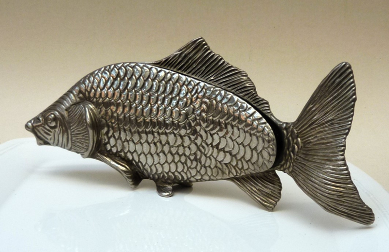 Verzilverde menukaarthouder in de vorm van een vis. Kan ook worden gebruikt als houder voor een paar servetten.