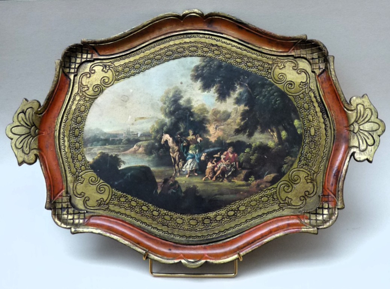Florentijns dienblad met op de bladspiegel een prent van een werk van een oude Meester. Oranje/gouden omlijsting. Gouden achterzijde met ruitpatroon.