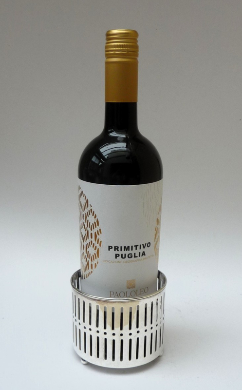 Verzilverde flessenbak gedecoreerd met een opengewerkt patroon. De bak staat op drie bolpootjes.