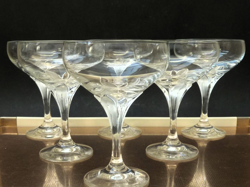 Set van 6 kristallen champagnecoupes met een steel die in aansluiting op de coupe is vormgegeven als bloemsteel met blad. De bladeren zijn gedeeltelijk gesatineerd.