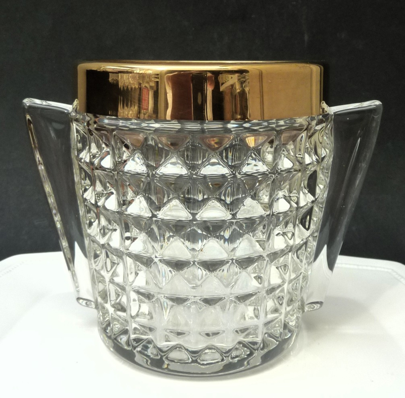 Ijsemmer gemaakt van dik persglas, gedecoreerd met een uitvergroot ruitpatroon. Twee langwerpige, hoekige grepen en een dikke goudkleurige band op de bovenzijde. Ontwerp in Hollywood Regency stijl. Verzamelaarsitem voor op de…