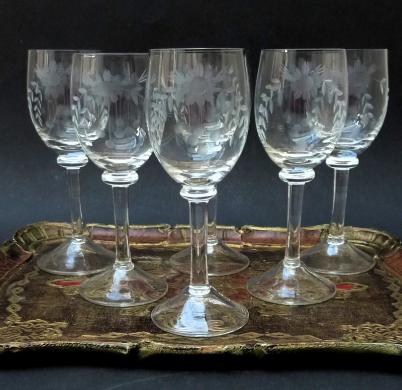Mooie set van zes wijnglazen in een iets kleiner model, geschikt voor het serveren van port of dessertwijn. De kelk van de glazen is gegraveerd met bloem guirlandes. De voet is conisch vormgegeven.