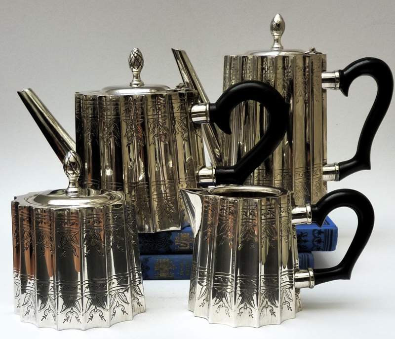 Vierdelig verzilverd koffie- en theeservies, bestaande uit een koffiepot, theepot, roomkan en een suikerpot met deksel. Uitgevoerd in een geribd model met gegraveerd decor. Bakelieten handvatten. De koffie- en theepot hebben een…