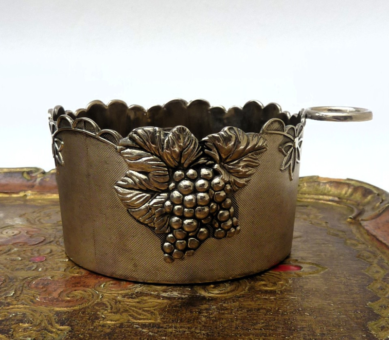 Verzilverde flessenbak met opgelegde decoratie van bloemen en een druiventros. Ringvormige greep. Zwarte kunststof bodem met houtlook. Geschulpte rand. Het verzilverde metaal heeft een oppervlakte met structuur, waardoor de bak…