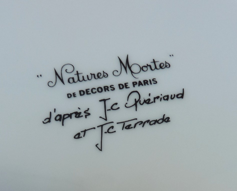Serving dish Decors de Paris Nature Mortes Les GibiersVery large porcelain dish "Les Gibiers" (the game), decorated with a print of shot game. From the "Natures Mortes" tableware series by Decors de Paris, inspired by the work of JC Quériaud and JC Terrade. Green trim, black…