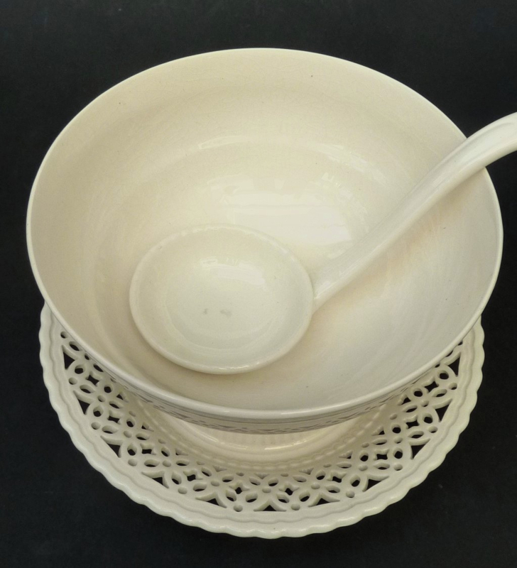 Leedsware footed sauce bowl or compotière with a matching underplate and serving spoon. 1980s, based on an 18th-century example. Openwork pattern on both the lid and the plate. Lightweight quality, characteristic of Leedsware.