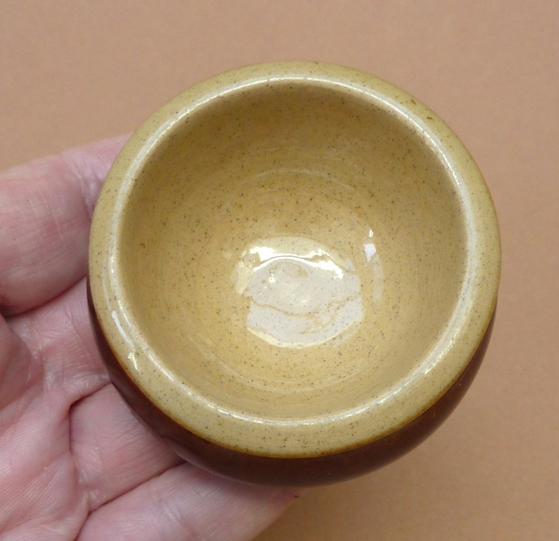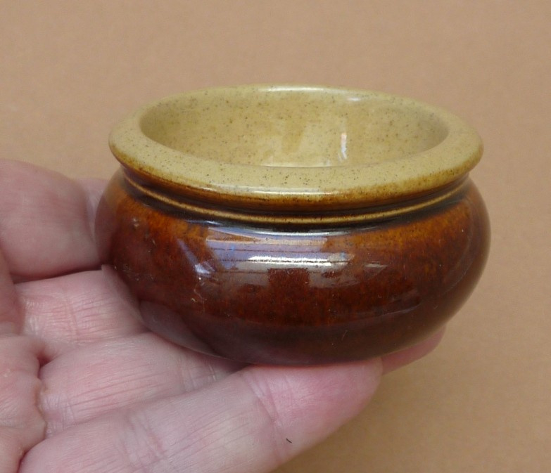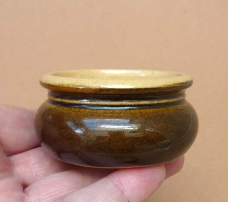 A pair of ceramic butter patties, high-gloss glazed in chestnut brown and green-brown. Dark cream interior.