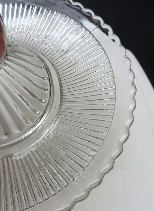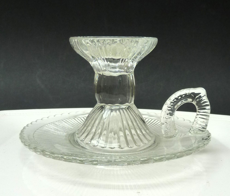 A pair of transparent, colorless pressed glass chambersticks with a scalloped rim and ribbed pattern.