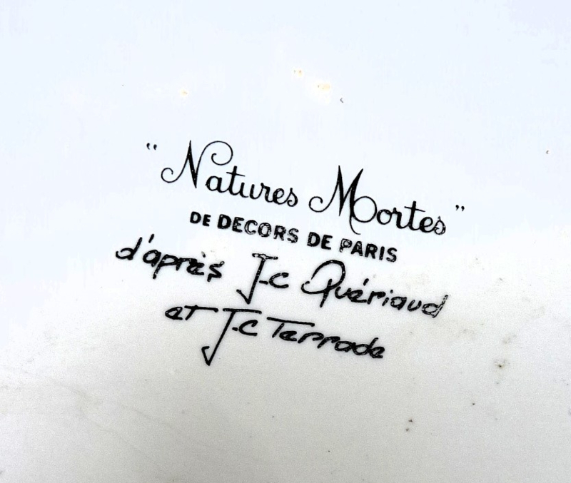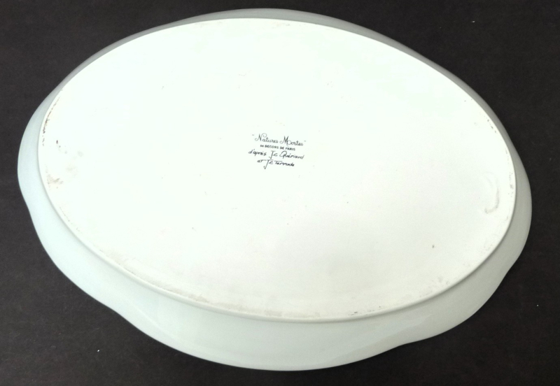 Very large porcelain dish "Les Gibiers" (the game), decorated with a print of shot game. From the "Natures Mortes" tableware series by Decors de Paris, inspired by the work of JC Quériaud and JC Terrade. Green trim, black lettering.
