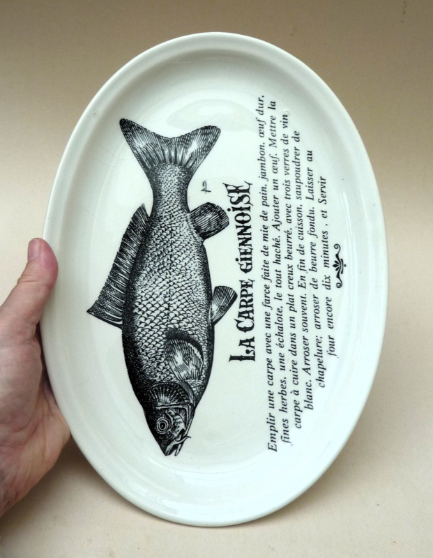Oval faience fish plate, decorated with a black print of a carp and the recipe for Carpe Giennoise.