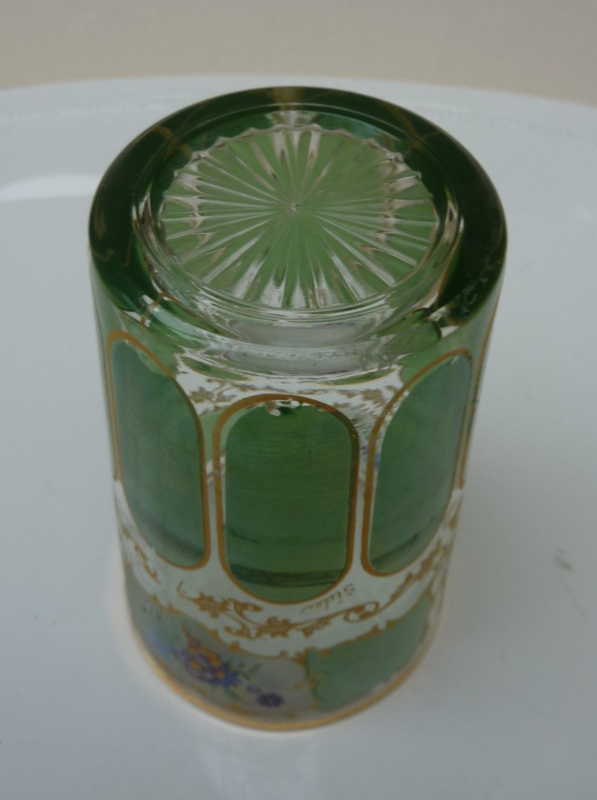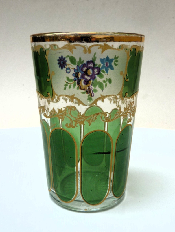 Three Bohemian pressed glass tea glasses, hand-painted with enamel paint, made in the early 20th century, 1900–1930. In the style of Moser and Egermann, and the St. Louis glasses in pattern Rabat.