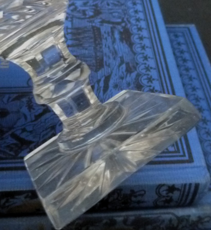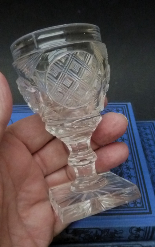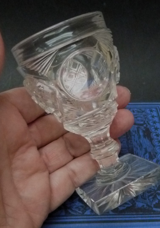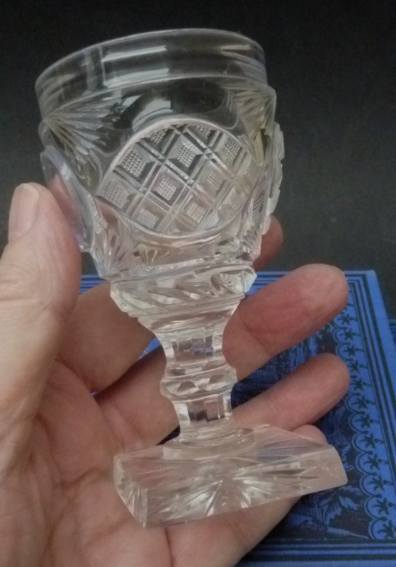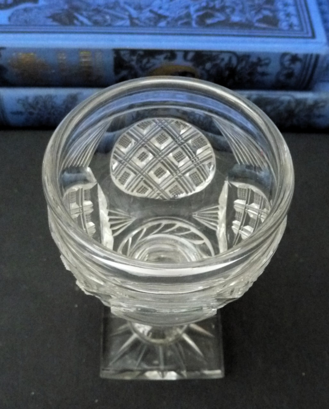 Rummer wine glass with a bowl featuring two eyes and two circles. The eyes and one circle are decorated with diamond cuts, surrounded by sun rays. One circle is uncut and functions as a lens. The thick foot is square, and the base is star-cut. Facet-cut stem.