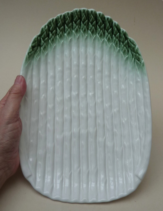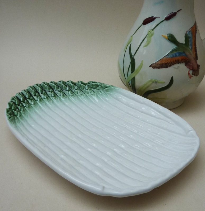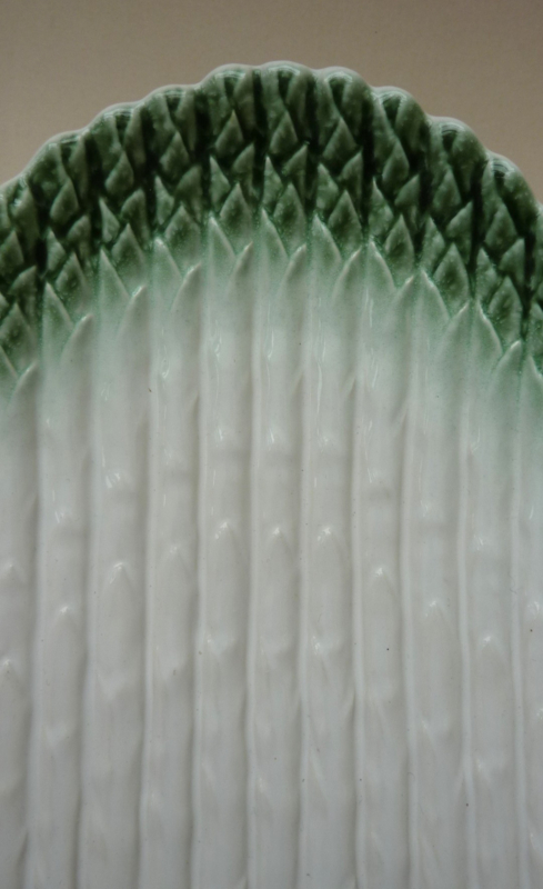 White-glazed faience asparagus dish, decorated in relief with asparagus with green tips.