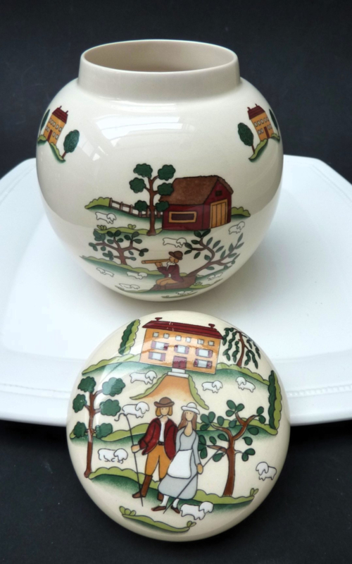 Lidded ginger jar from Mason's service Country Lane service, featuring colorful, stylized depictions of English rural life. Designed by Marsten-Mandrajji. Discontinued.