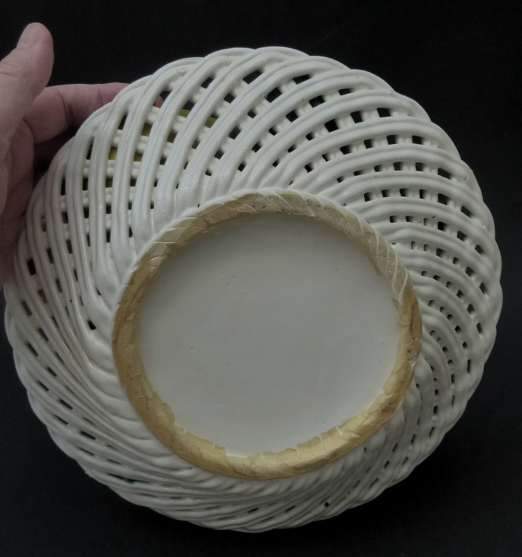 Off-white woven faience basket filled with decorative fruits and vegetables. The vegetables are attached to the bowl.