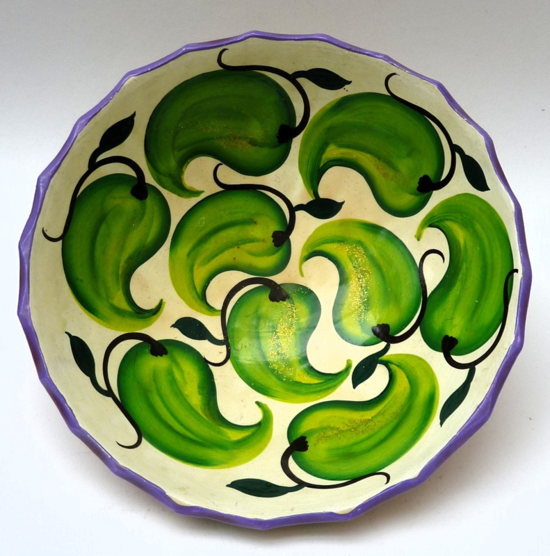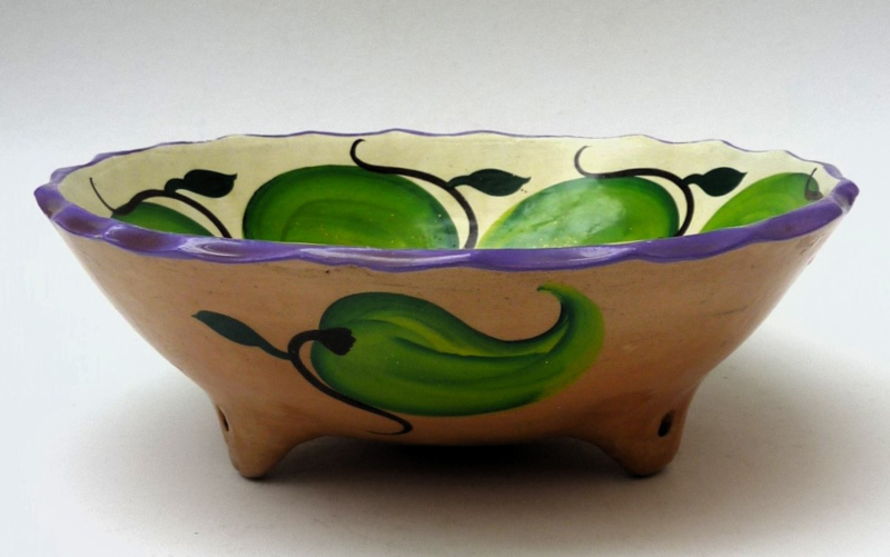 Decorative, hand-decorated pottery bowl on three feet. The inside is decorated with a cheerful design of green chili peppers against an off-white background. The green chili peppers have golden speckles. Fully glazed.
