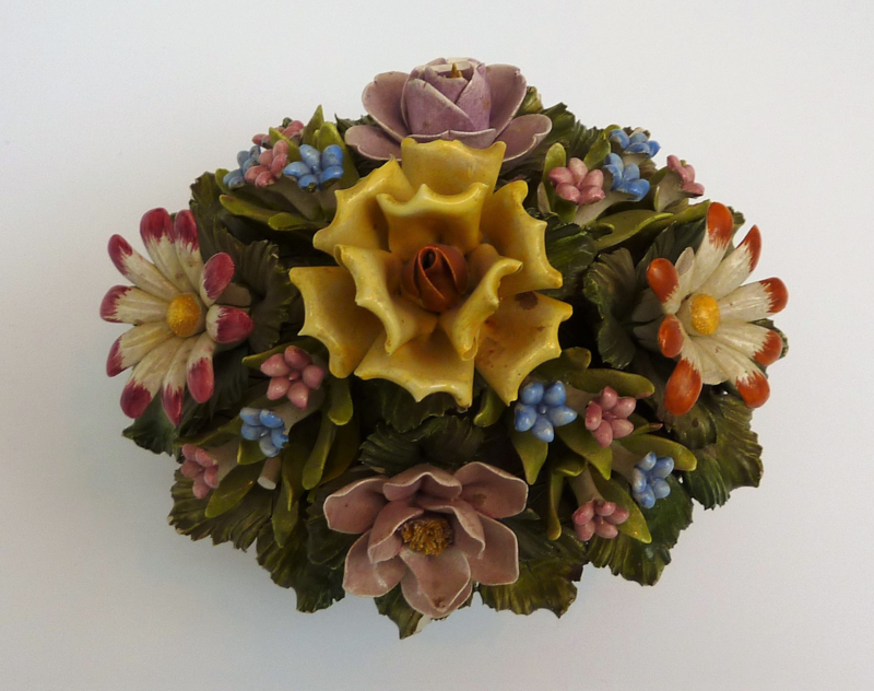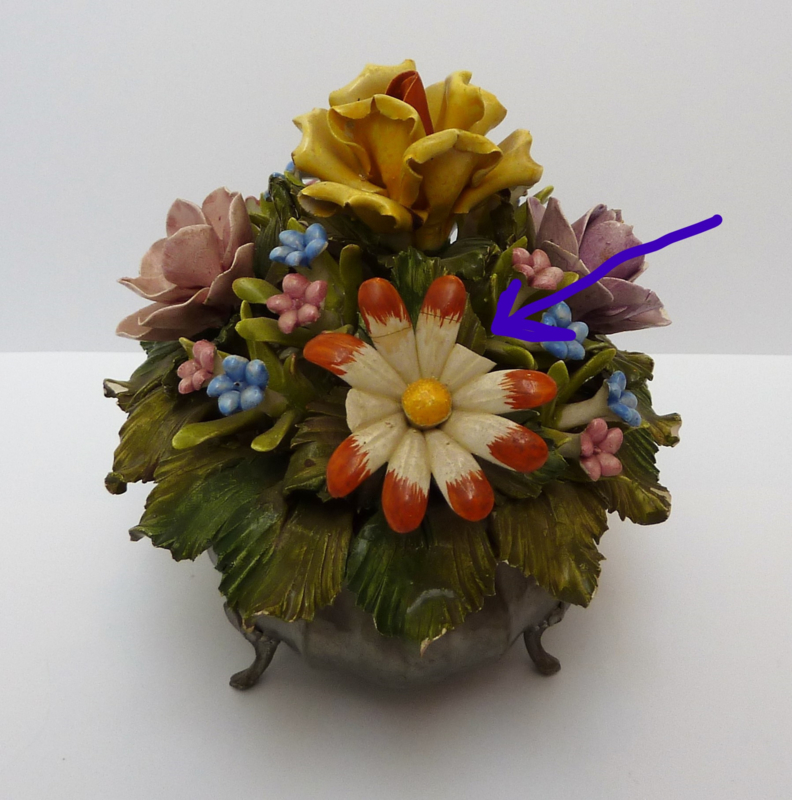 Only the pewter container is marked: Peltro 95%, garantito (guaranteed 95% pewter). The bouquet is not marked but is 'written all over' Capodimonte. The style of the bouquet is fifties.