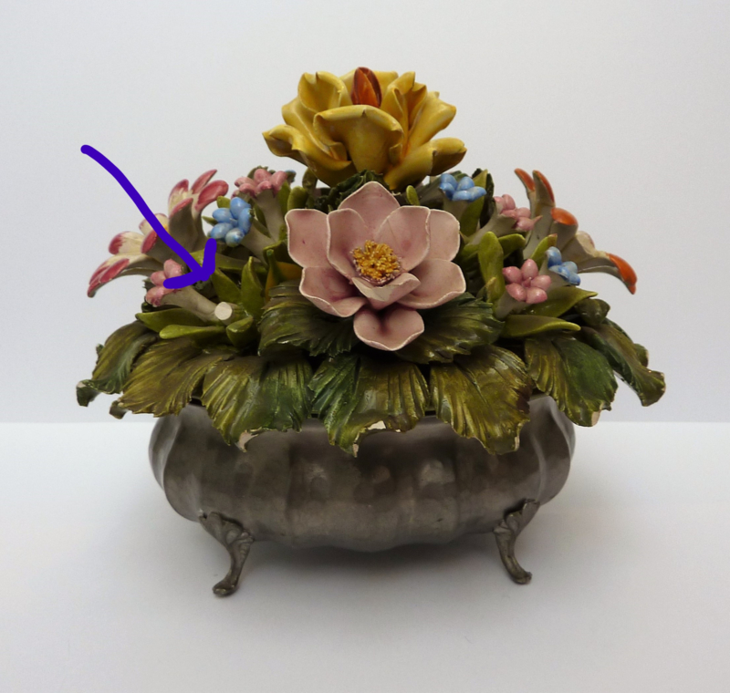Handmade Capodimonte porcelain bouquet in a pewter vase. The fine handicraft bouquet has unfortunately been damaged in various places (see the photos).