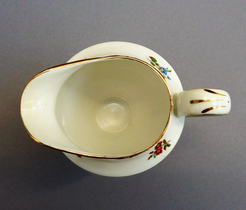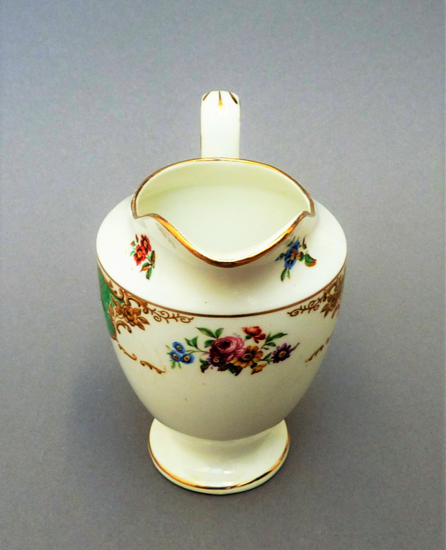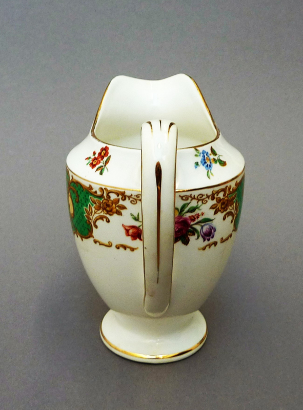 Grosvenor England porcelain milk jug, decorated with the colorful decor Denbigh. The band has emerald green panels, lined with camel colored rocailles with small, multicolored bouquet of wild flowers in between.