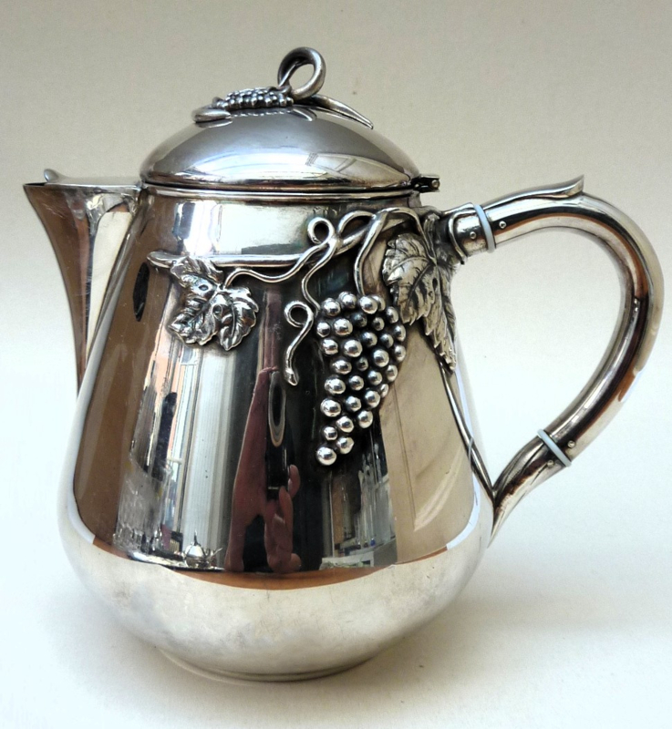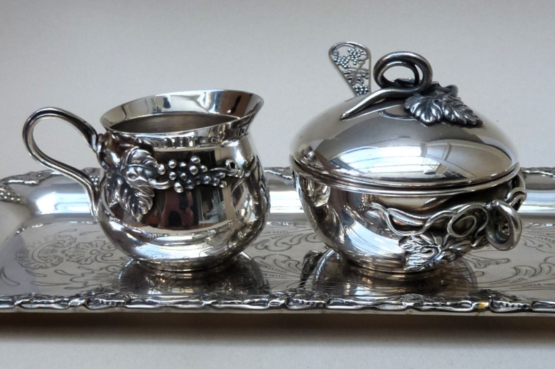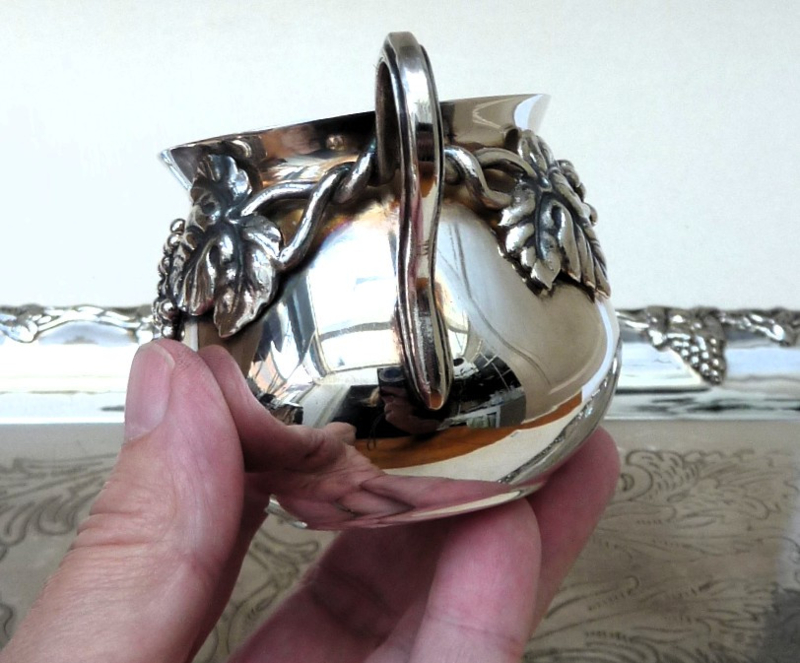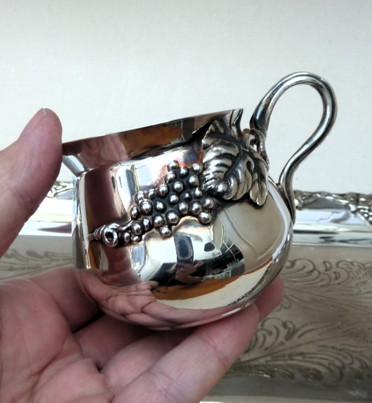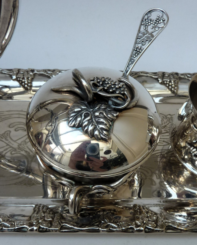 Five-piece silver-plated tea set, consisting of a teapot with a hinged lid, a sugar bowl with a lid, a sugar spoon, a cream jug, and a rectangular tray. All pieces are decorated with grape vines. The tray has an engraving on the mirror.