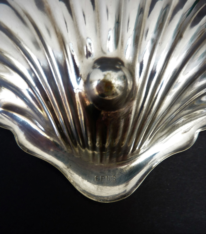 Antique English shell-shaped butter or caviar dish with a milk glass inner tray.