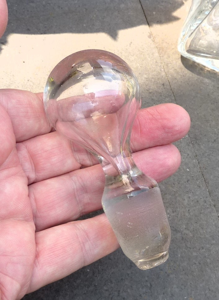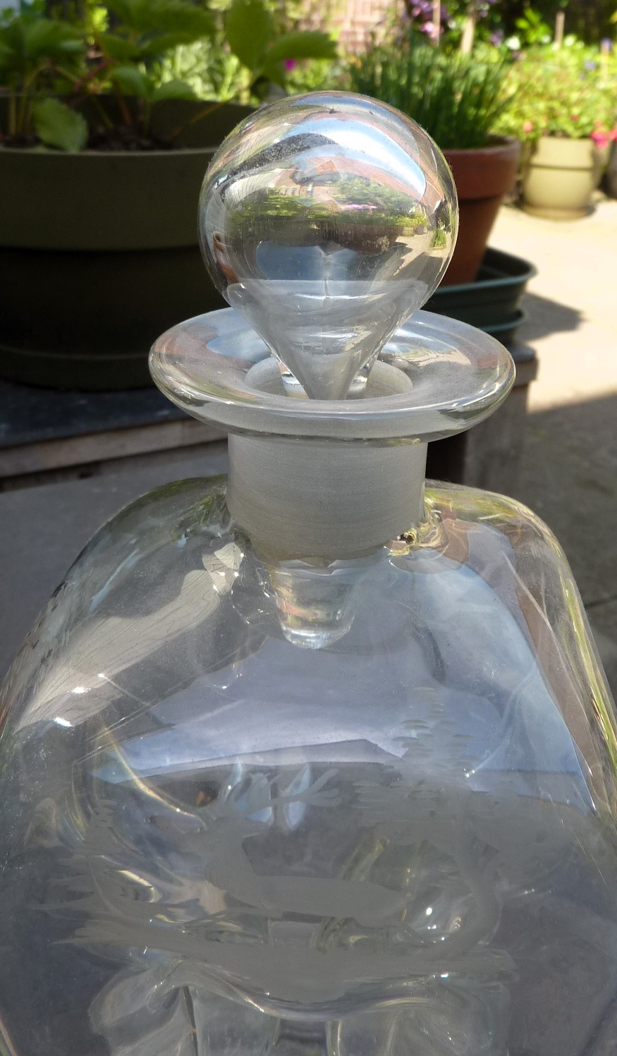 19th century pinch bottle, decorated on 4 sides at the top with a hunting-related engraving; a pheasant, a deer, a black grouse and a red deer. The 4 undersides are engraved with a garland. The round, flower-shaped stopper is from this period, but not original because it is slightly longer dan usual.