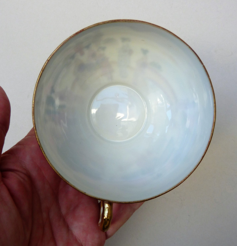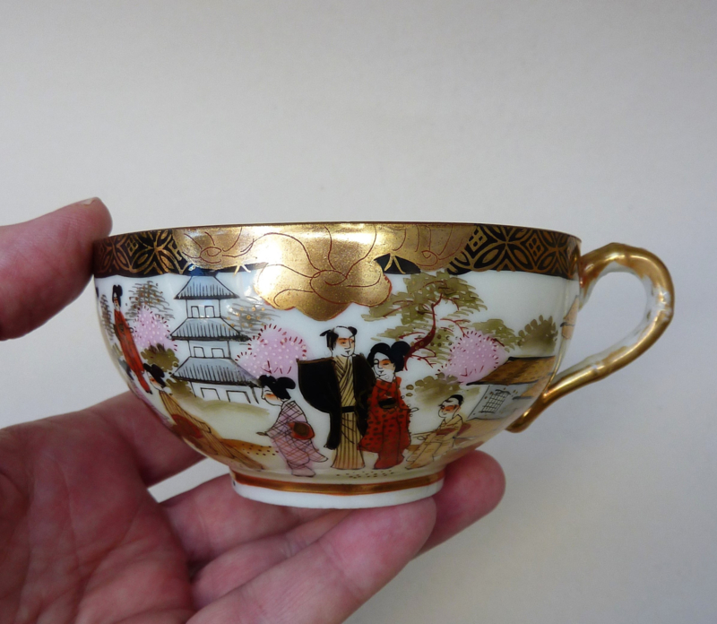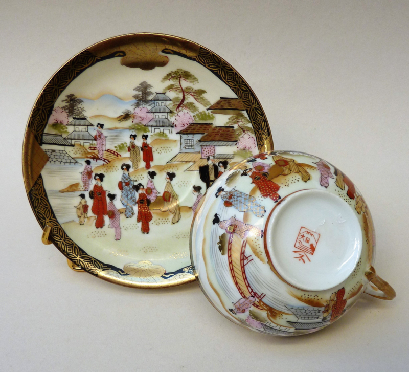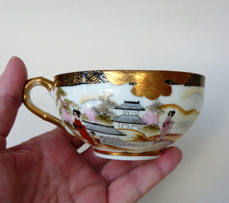 Stunning richly painted Japanese Geishaware porcelain tea cup with saucer. Detailed painting, soft pastels, lots of gold.